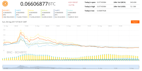 Relative value of Bitcoin cash (BCH) to Bitcoin (BTC) – Market Data Chart sourced from Brave New Coin