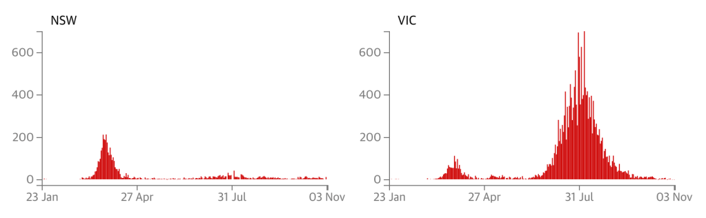 Finally, I should also stress that I am very grateful to be living in Australia at present during this global pandemic, especially given the situation in many other countries. But at the risk of sounding parochial, I really would like to understand why Victoria got it so wrong (and has had to endure a second and onerous lock-down), and how NSW (so far) appears to have got it just about right.