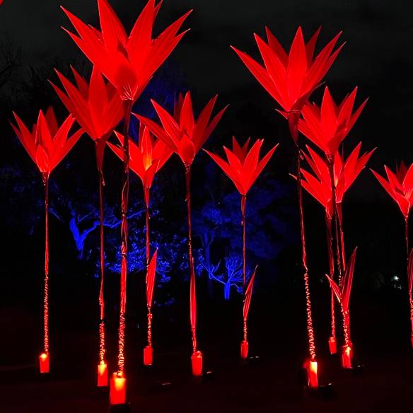 Throughout the gardens, there are a range of animated lights, illuminated displays and projections. I’m sure everything has been carefully designed and planned, but there are some happy accidents: the lasers from Liquid Sky extend beyond their misty clouds to flicker amongst the foliage of surrounding trees; many lights reveal the natural iridescence of flowers that we are unable to see by day; and the reflection of the Winter Cathedral on the nearby lake suggests the climactic scene in Peter Carey’s novel “Oscar and Lucinda”, when the crystal chapel sails down the river.