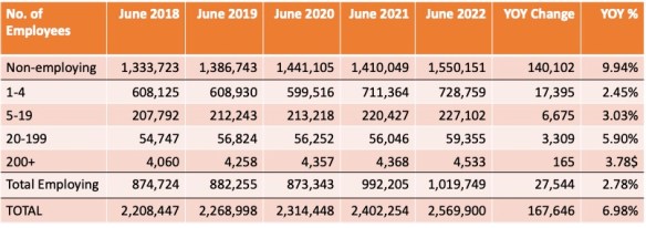 Number of Australian companies by employment size, 2018-2022 (Source: ABS)