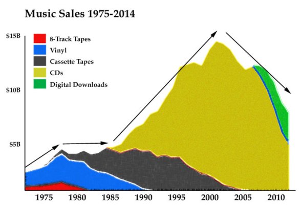What can we learn from the music industry based on the apparent rebound of vinyl sales in recent years? Is streaming doing enough to halt the decline in total music revenue? Will CD’s soon disappear altogether? What future for LPs in a world of “Album Equivalent Sales”, “Track Equivalent Albums” and “Streaming Equivalent Albums”?